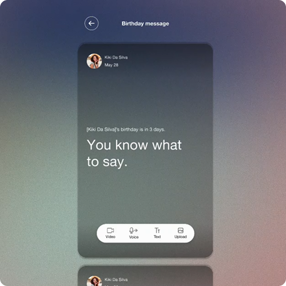 Learn more about Birthday >Receive gentle reminders to check in and keep conversations flowing. Small, consistent nudges make staying connected effortless.